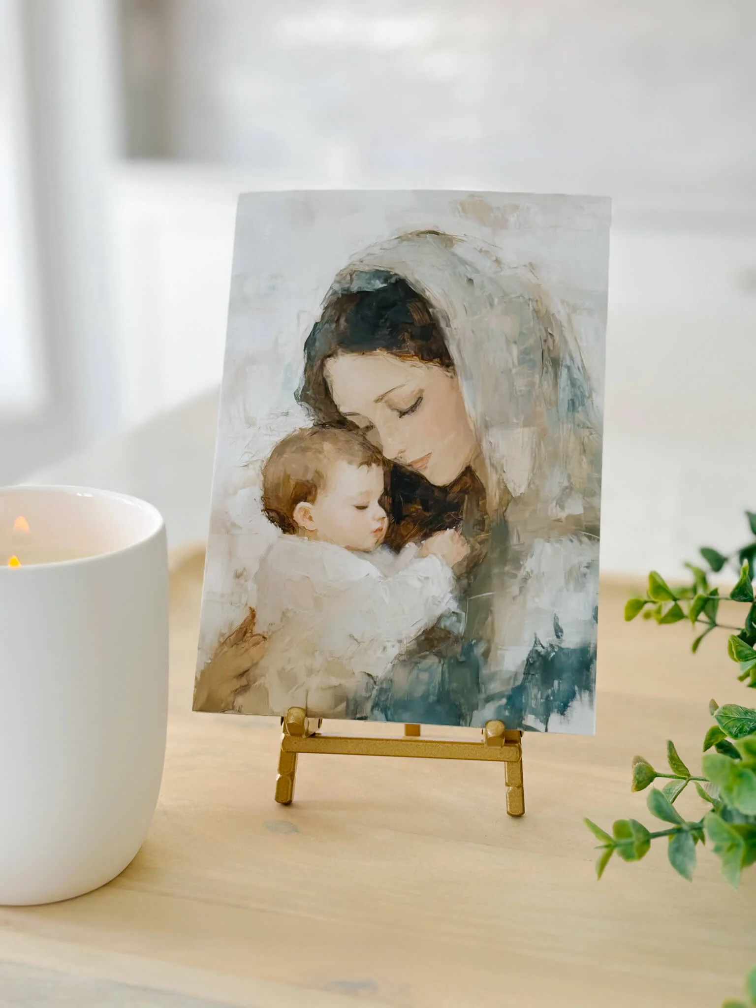 This piece invites reflection on both earthly and heavenly motherhood. Just as Mary cared for Christ, she continues to intercede for us, drawing us closer to her Son. The gentle tones and painterly texture create a sense of warmth and stillness, making it a beautiful addition to a nursery, prayer corner, bedside table, or Marian altar.