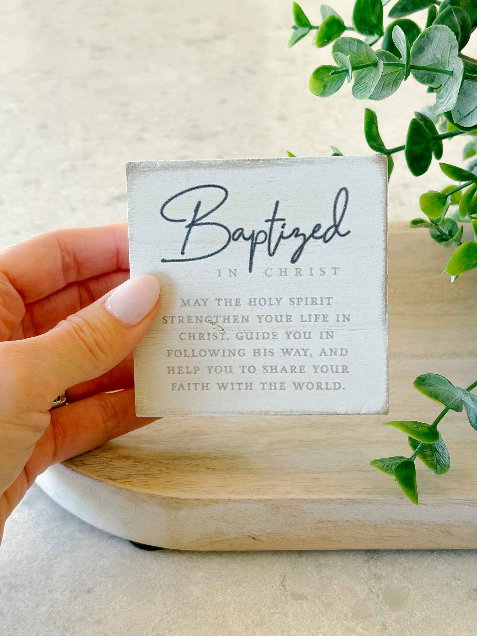 This small tabletop plaque beautifully celebrates the sacrament of Baptism, a life-changing moment when one is welcomed into the family of Christ. The plaque features the text: “May the Holy Spirit strengthen your life in Christ, guide you in following His way, and help you to share your faith with the world.” A perfect reminder of the grace received in this sacred sacrament.
