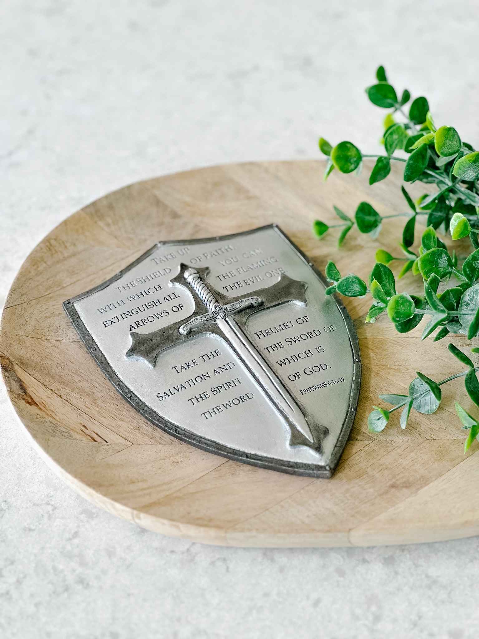 The Breastplate of Faith is a faithful reminder of the protection we have in God's word and promises. Unequaled in strength and beauty, the Breastplate of Faith reminds us of the scriptural promise to safeguard against all spiritual adversities. Display it in your home or give it as a gift.