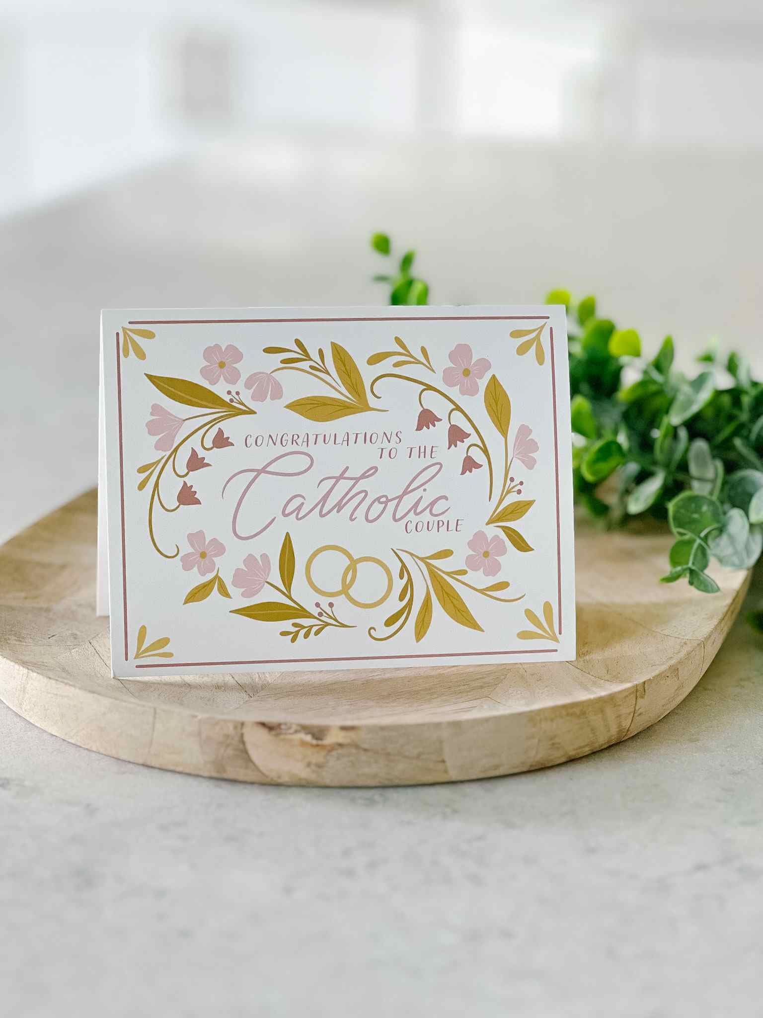 This elegant card is the perfect token to commemorate a Catholic couple's celebration of the sacrament of marriage. Its intricate design and flowing vines bring joy and delight to all who behold it. Show your appreciation of this momentous life event with this unique card. Choose between two colorways: Blue & White or Pink & Gold.