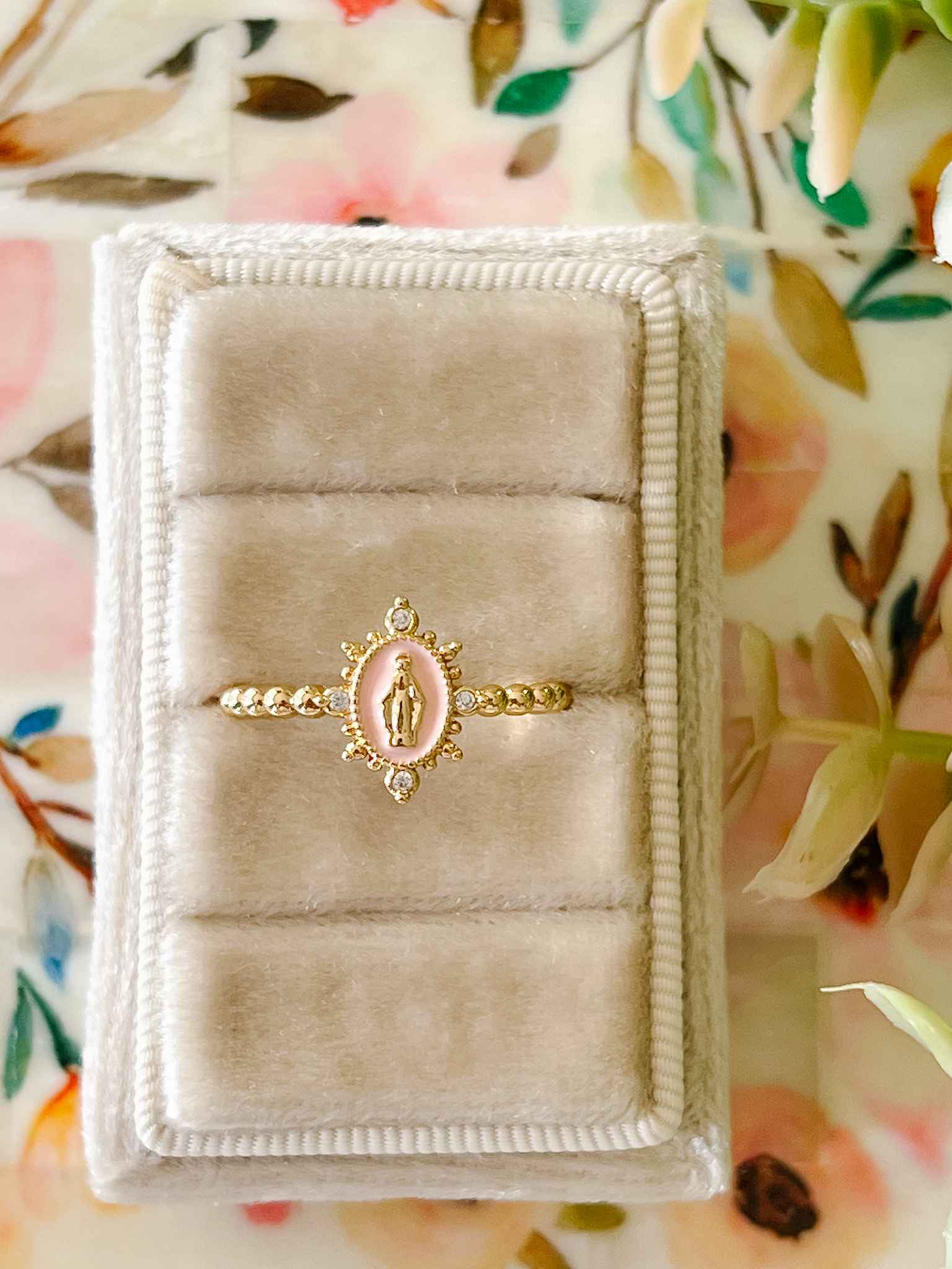 Deepen your faith with our Lady Lourdes Ring in Heavenly Pink, an exclusive House of Joppa color. This piece features a dainty ball band highlighting a portrait of the Virgin Mary that is surrounded by ornamental cubic zirconia accents and embellished spike details. It’s a perfect neutral for your daily stack of rings. Wear this gold ring every day and let the Virgin Mary guide your hands to help others. It’s a beautiful reminder of how Mary watches over all of God’s children.