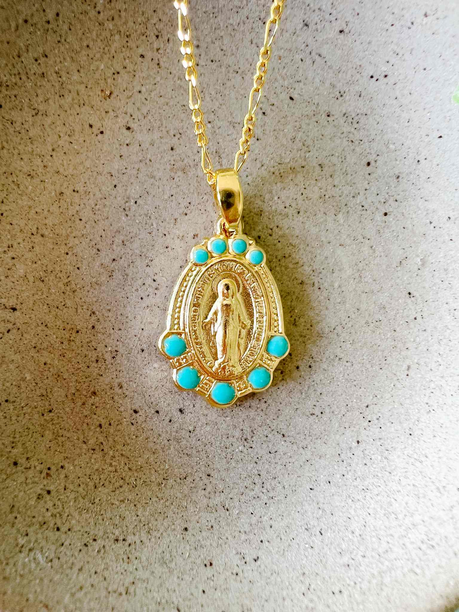 The Mary Medallion in Turquoise features a stunning 3/4" Mary Medallion with enamel Turquoise accents on a fine chain. This necklace is a great layering piece.