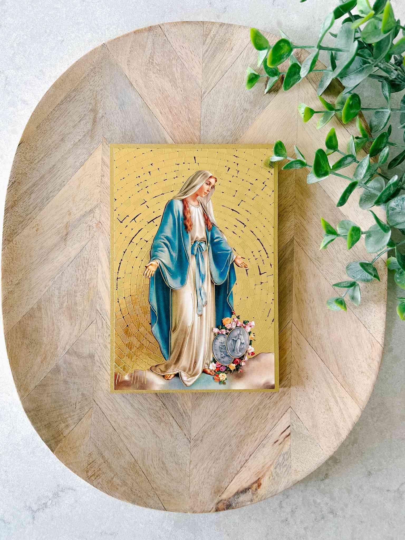 Unite your home's sacred spaces and honor your faith with this petite Our Lady of Grace Plaque. Crafted with intricate gold foil and mosaic detailing, this captivating religious icon symbolizes the promise of her prayer and the beauty of your devotion. Featuring the prayer to Our Lady of the Miraculous Medal on the back, it makes the perfect gift.