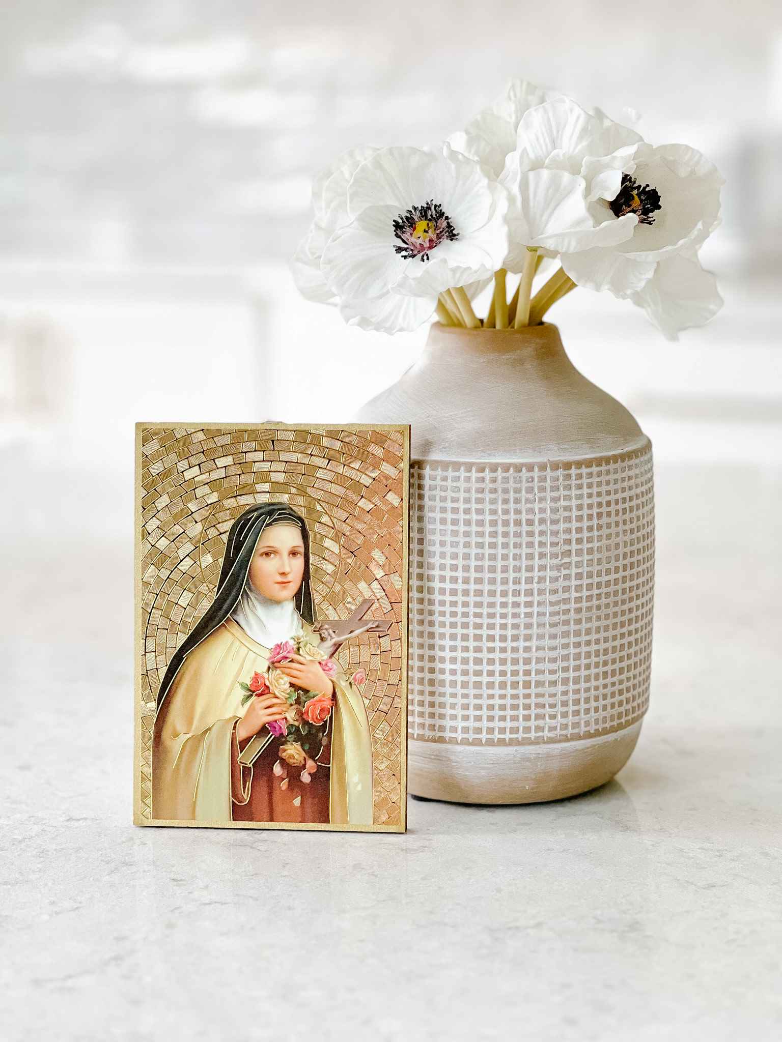 Unite your home's sacred spaces and honor your faith with this petite St. Therese of Lisieux Plaque. Crafted with intricate gold foil and mosaic detailing, this captivating religious icon symbolizes the roses she promised from Heaven and the beauty of your devotion. Featuring the prayer to St. Therese, the Little Flower on the back, it makes the perfect gift.