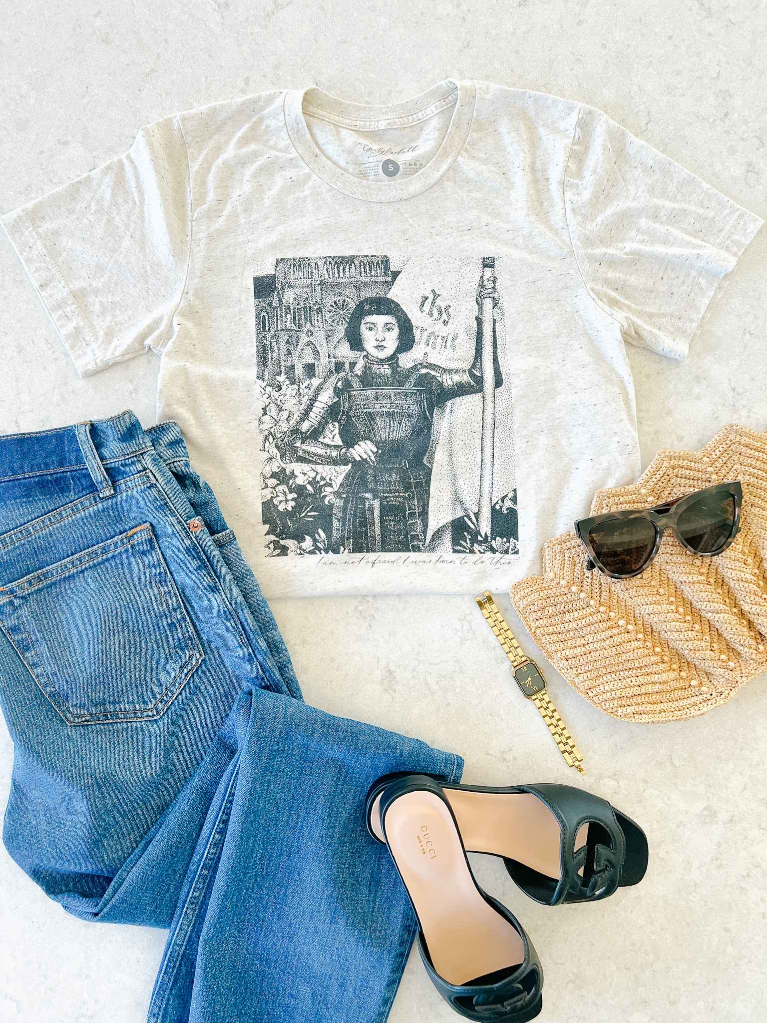 This oatmeal-hued, unisex tri-blend tee features an original pointillism illustration by Emily Rachelle, based on the 1903 engraving by Albert Lynch. Taking inspiration from Saint Joan of Arc, the message is one of courage and strength: "I am not afraid. I was born to do this."