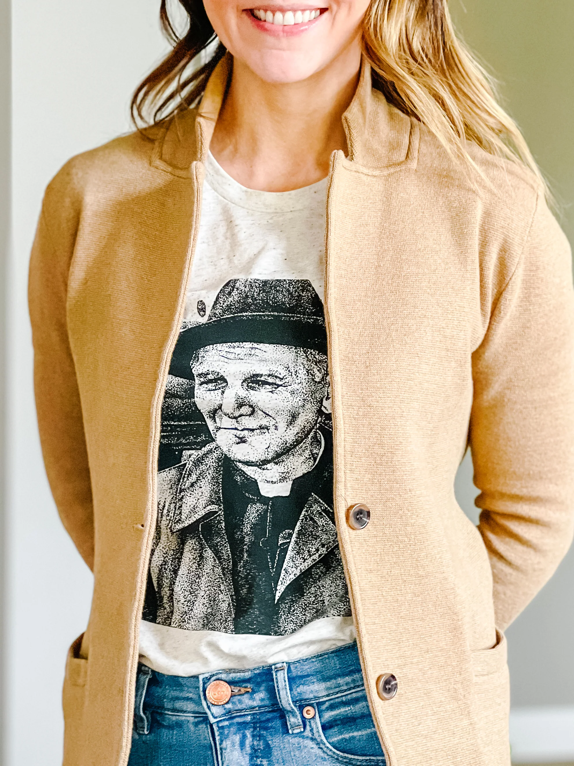 This oatmeal-hued, unisex tri-blend tee features an original pointillism illustration by Emily Rachelle. Taking inspiration from Saint John Paul II, the message is one of courage and strength: “Do not be satisfied with mediocrity. … Do not be afraid to be holy! Have the courage and humility to present yourselves to the world determined to be holy, since full, true freedom is born from holiness. This aspiration will help you discover genuine love, untainted by selfish and alienating permissiveness.”