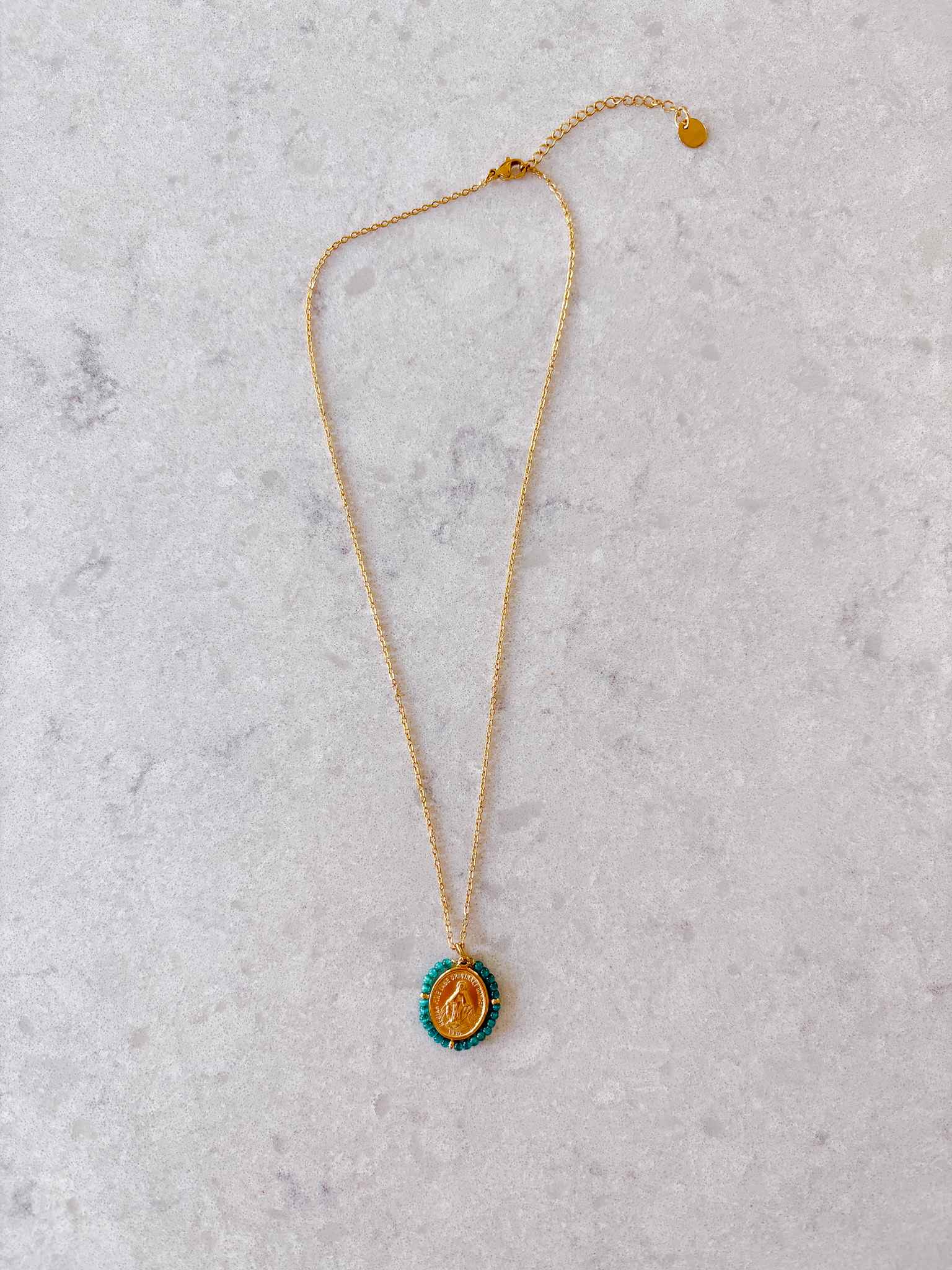 Our Santa Maria Precious Necklace in Tiffany (Green) is a modern heirloom, designed to honor the Blessed Mother with understated luxury and everyday wearability. At its center rests a golden Miraculous Medal, a cherished sign of Mary’s protection and intercession. Surrounding the medal, a halo of hand-set semi-precious stones in a luminous Tiffany green catches the light beautifully — a subtle yet striking detail that sets this piece apart.